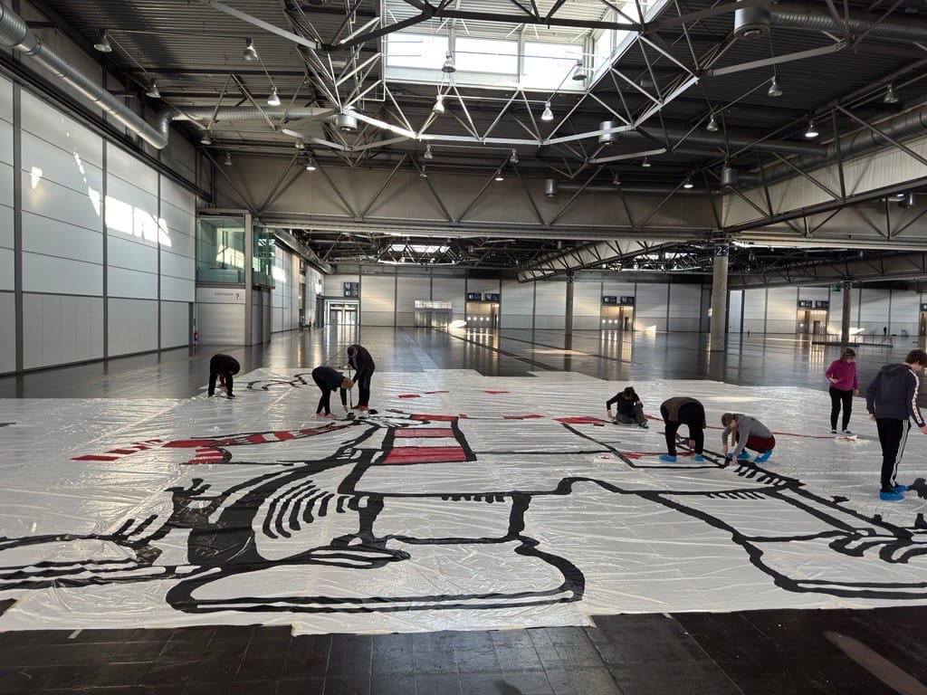 Nachdem auf die einzelnen Folienbahnen korrekt vorgezeichnet wurde, müssen diese nun zusammengeklebt werden, um das Gesamtbild entstehen zu lassen. Hierfür werden die feuerfesten Folien mit feuerfestem Klebeband miteinander verbunden.