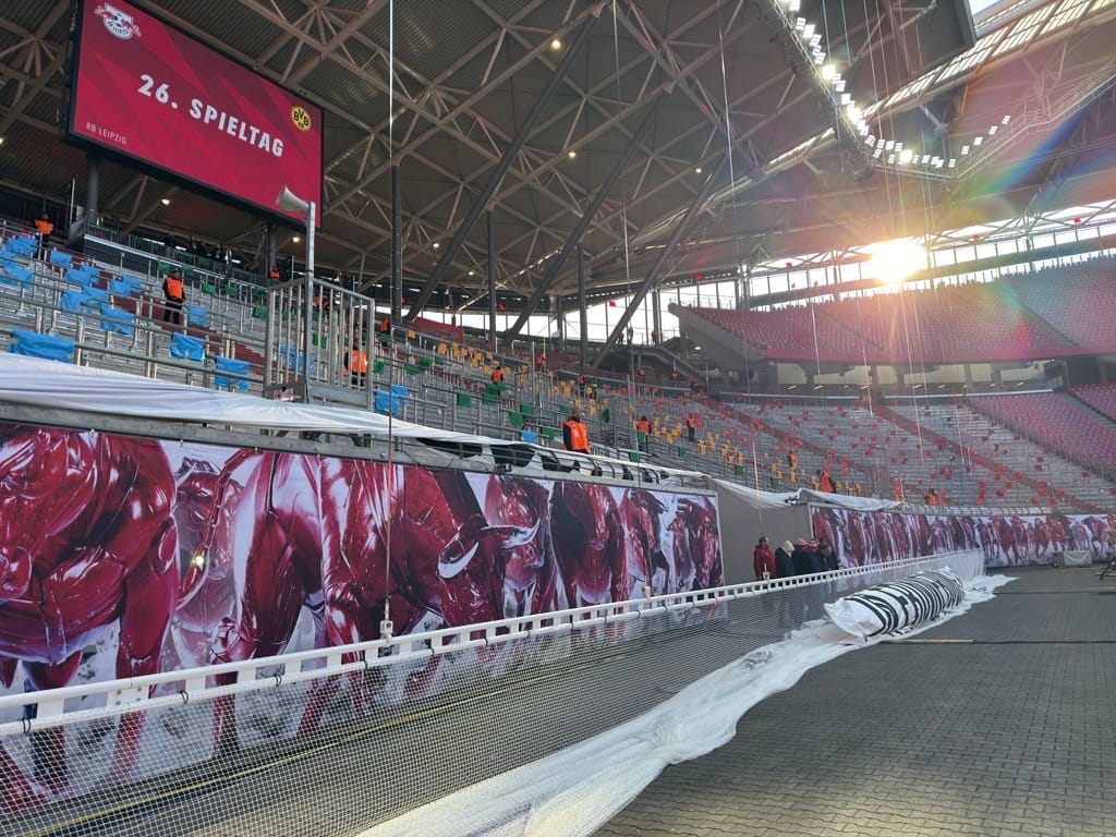 Am Spieltag muss die Choreo aufgebaut werden. Hierfür müssen zum einen Folienschals, Doppelhalter, Fahnen oder ähnliches auf den Zuschauerrängen verteilt werden, zum anderen aber auch Banner oder Spruchbänder angebracht werden.
